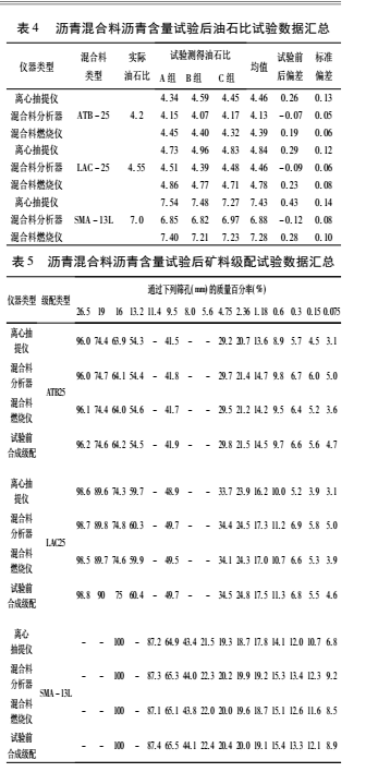 和表 5 中將此三種儀器分別簡(jiǎn)寫成離心式瀝青抽提儀、混合料分析器、混合料燃燒儀) 將拌制好的瀝青混合料進(jìn)行瀝青含量抽提試驗(yàn),試驗(yàn)結(jié)果見表 4、表